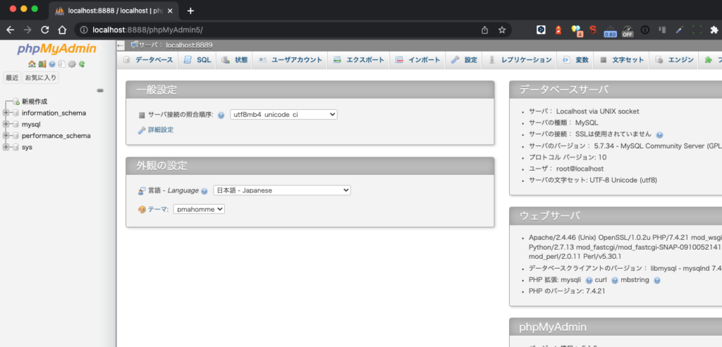 phpMyAdminへは、http://localhost:8888/phpMyAdmin/でアクセスできます。