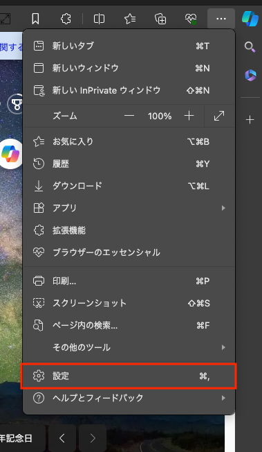 「設定」をクリックするとEdgeの設定画面が表示されます。