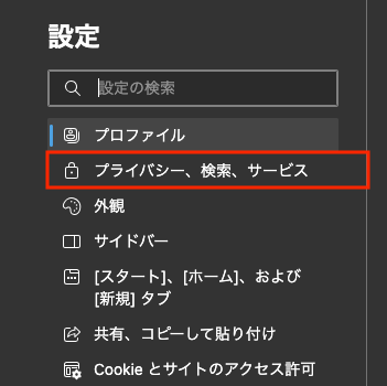 表示された設定画面の左側のメニュー項目から「プライバシー、検索、サービス」をクリックします。